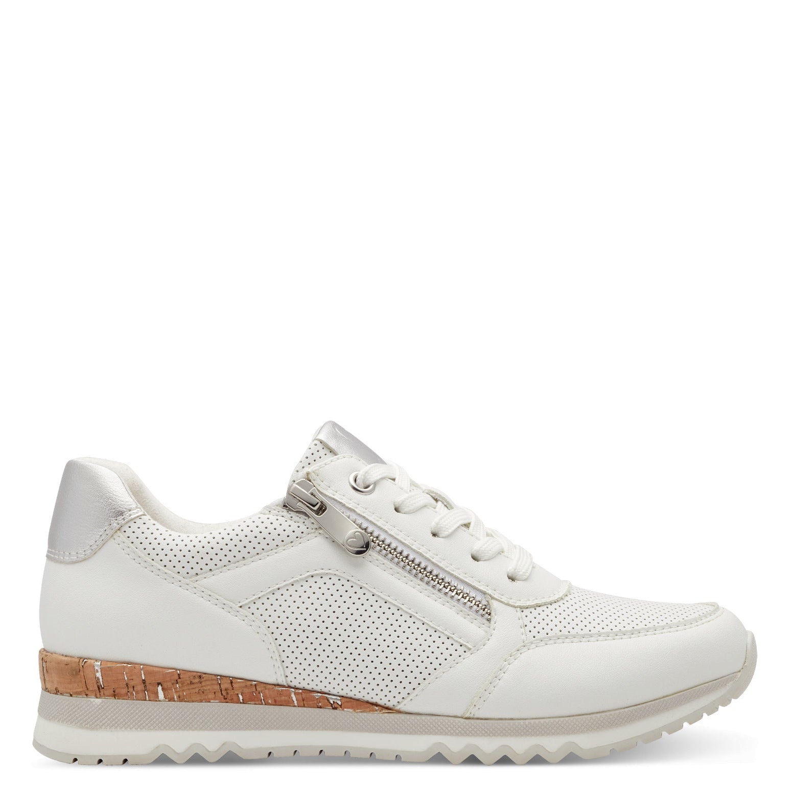 A fun and stylish trainer from the Marco Tozzi collection in a great crisp white with some lovely detailing. This trainer has a lace fastening alongside a side zip which makes it quick and easy to put on and a wedge sole.