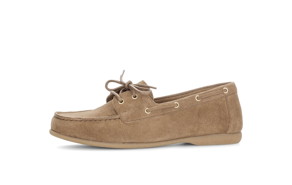 A modern twist on the moccasin, featuring soft light brown suede, lace detailing, a supportive sole, and a low everyday heel—this versatile piece is a perfect addition to your wardrobe this season.